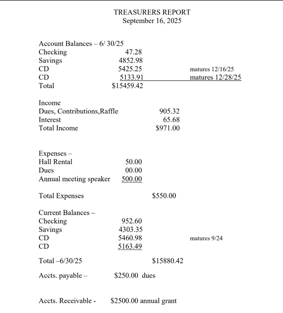 - We got good feedback regarding the newsletter. Debbie will wait until the spring to get printing quotes for next year’s newsletter.