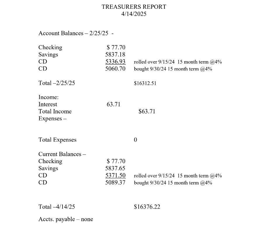 The following is the treasurer’s report that Ted shared: